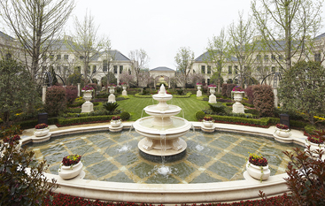 藍城法式排屋借鑒了法國古典主義立面構圖,采用縱橫三段式,幾何感強烈,軸線明確,主從清晰。底層厚重,中層是虛實相映的柱廊,頂部是水平厚檐。細節(jié)處理上采用了古典柱式、山花、線角等,制作工藝精細考究。在立面處理上多采用法國古典主義建筑符號,例如三段式立面、古典柱式、坡屋頂、窗套、老虎窗等。