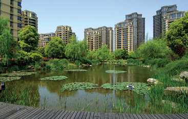 綠園高層公寓系列交通組織實行組團人車分流,車行布置于外圍,或者直接從主入口進入地下車庫;組團內為步行系統(tǒng),僅設置消防車道?;顒有蓍e場地沿綠化帶散布其中,營造富有活力的社區(qū)核心公共空間。會所的室外泳池和庭院景觀,結合小區(qū)中心公共綠地設計,將人的活動融于其中。